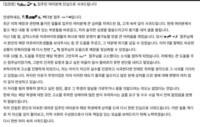 8일 소셜미디어와 온라인 커뮤니티에는 충북 청주시에서 카페를 운영하는 점주 A씨의 입장문이 공유되었다. A씨는 입장문 시작부터 "아파트 입주민 여러분께 진심으로 사과드린다"며 입주민을 주된 사과 대상으로 삼았다.