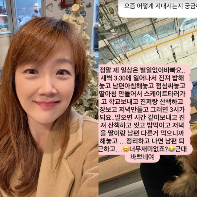 그는 이어 “딸 오면 시간 같이 보내고 반려견 산책하고 씻고 밥 먹이고 저녁을 딸이랑 남편 다른 거 먹으니까 해놓고, 정리하고 나면 남편 퇴근하고”라며 “너무 재미 없죠? 그런데 바쁘네요”라고 했다.