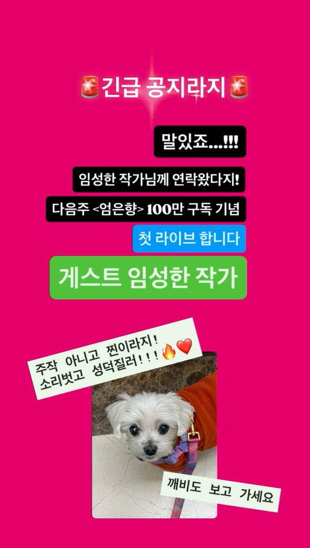 공개된 게시물에 따르면 임성한 작가는 엄은향 채널의 100만 구독자 달성을 기념해 진행되는 첫 라이브 방송에 게스트로 출연할 예정이다.
