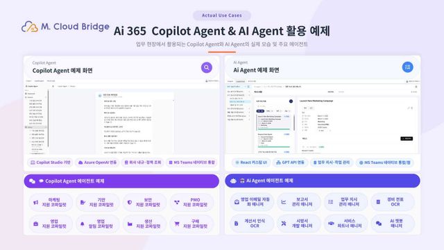 엠클라우드브리지는 범용성과 표준성이 높은 업무는 코파일럿 에이전트로 처리하고, 매출·원가·품질·리스크 등 핵심 지표와 직결된 프로세스는 AI 에이전트로 맞춤 설계하는 기준이 필요하다고 밝혔다.