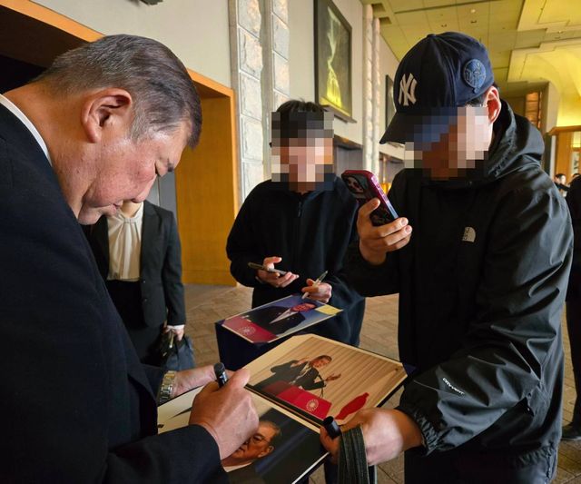 이시바 전 총리는 이날 오후 자신의 X(엑스·옛 트위터) “한국 청년들에게 사인 요청을 받았다”고 올렸다. 이와 함께 공개한 2장의 사진에는 총리 시절 모습이 담긴 사진첩에 사인하는 이시바 전 총리의 모습이 담겨 있다. 이 사진첩을 가져온 것으로 보이는 남성은 사인하는 이시바 전 총리의 모습을 휴대전화에 담고 있다.