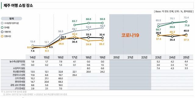 외국인 관광객의 제주여행 쇼핑 장소(중복 응답)는 시내 상점가가 72.4%로 가장 높은 비중을 차지했다. 2015년(12.1%)과 견주면 눈에 띄는 변화다. 면세점 쇼핑은 71.9%로 지속적으로 활용되는 것으로 나타났다. 대형마트 쇼핑은 2015년 9.5%에서 지난해 40.0%로 늘었고, 같은기간 전통시장 쇼핑은 8.3%에서 37.3%를 차지했다.