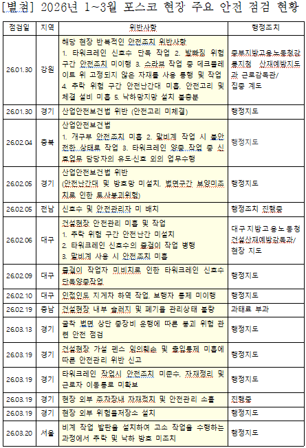 전국건설노동조합은 8일 서울 강남 포스코센터 앞에서 기자회견을 열고 포스코이앤씨에서 지난해에만 5명의 건설 노동자가 숨졌음에도 2026년 1~3월 70여 건의 안전조치 미흡 사항이 노동당국 등에 의해 적발됐다고 밝히고 그 중 주요 사례를 소개했다.