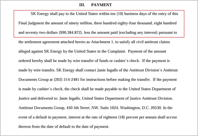 이에 미국 법무부는 지난 2018년 11월, 사안의 중대성을 고려해 형사 기소와 민사 소송을 동시에 진행하는 초강수를 뒀으며 결국 SK에너지는 재판에서 유죄 판결을 받았다. 당시 판결 결과에 따라 SK에너지는 형사 벌금 약 3408만달러, 민사 배상금 약 9038만달러 등을 합쳐 총 1억2446만달러(당시 환율 기준 약 1400억원)을 지불해야 했다. 이는 함께 적발된 GS칼텍스(약 1억400만달러)나 ㈜한진(약 618만달러) 등 다른 국내 기업들에 비해 압도적으로 높은 처벌 수위였다.