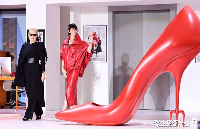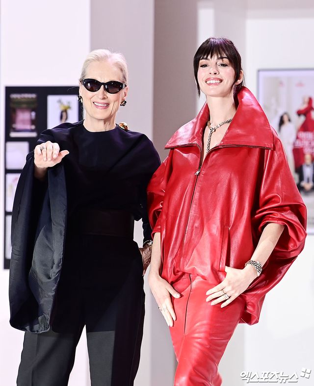 이날 두 배우는 영화의 상징인 블랙과 레드의 대비를 의상으로 완벽히 재현했다. 메릴 스트립은 블랙 드레이프 상의와 와이드 벨트로 완성한 올 블랙 룩으로 편집장의 카리스마와 레전드 배우의 우아함을 동시에 뽐낸 반면, 앤 해서웨이는 파격적인 레드 컬러의 레더 셋업으로 한층 진화한 패션 아이콘의 면모를 과시했다.