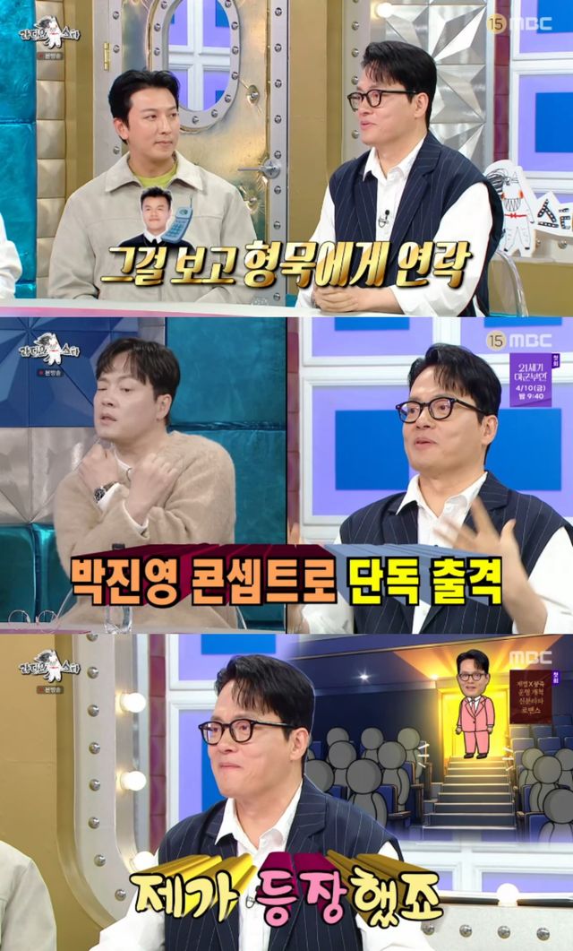 이날 방송에서 김형묵은 "몇년 전에 '라디오스타'에 나와서 JYP 박진영 선배님을 따라했었다. 그런데 그 영상을 보시고 저한테 직접 연락을 주셨다"고 했다.