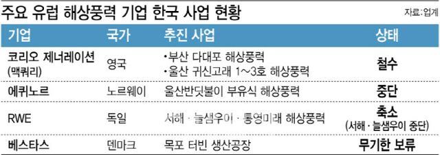 노르웨이 에퀴노르도 오랜 기간 추진해 온 750㎿ 규모 울산 반딧불이 부유식 해상풍력 사업을 올 들어 무기한 중단한 상태다. 독일 RWE 역시 올초 서해해상풍력(495㎿)과 신안 늘샘우이해상풍력(510㎿) 등 일부 사업을 정리하고 현대건설과 진행 중인 통영미래해상풍력 사업(360㎿)에 집중하는 등 국내 사업 포트폴리오를 조정 중이다.