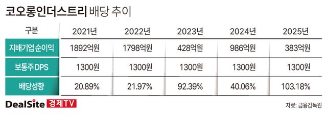 겉으로 보면 ‘통 큰 배당’이지만, 실제 구조는 다르다. 코오롱인더스트리의 DPS(주당배당금)는 보통주 1300원, 우선주 1350원으로 2021년 이후 5년째 동일하다. 유통주식수 변동도 없어 배당금 총액 역시 변화가 없다. 배당이 늘어서가 아니라 이익이 줄어들면서 배당성향이 급등한 셈이다. 실제 지난해 지배기업 순이익은 383억원으로 전년 대비 61.2% 감소했다. 분모가 급격히 줄어든 결과 배당성향이 100%를 넘어섰다. 시장에서 “고배당이 아니라 저이익의 다른 표현”이라는 평가가 나오는 배경이다.