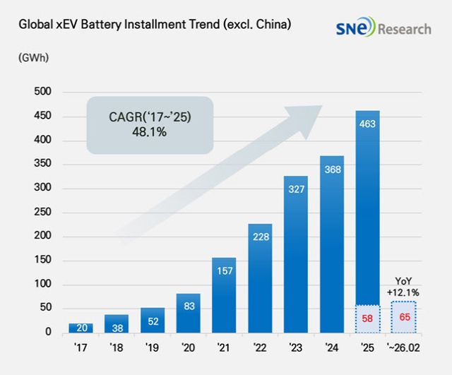 9일 시장조사업체 SNE리서치에 따르면 올해 1~2월 글로벌(중국 제외) 전기차(EV, PHEV, HEV)에 탑재된 배터리 사용량은 약 65.3기가와트시(GWh)로 나타났다. 이는 전년 동기 대비 12.1% 증가한 수준이다.