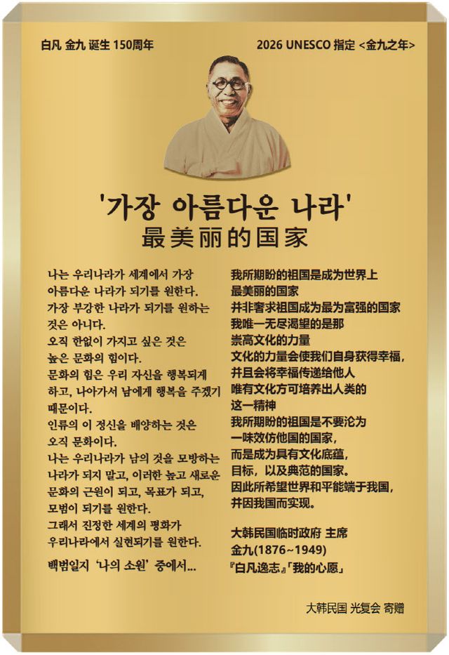 이번 동판은 백범 김구 선생 탄생 150주년과 유네스코 지정 ‘김구의 해’를 기념해 제작된 것이다. 김구 선생의 저서 <백범일지> ‘나의 소원’에 담긴 핵심 구절을 한글과 중국어로 함께 새겼다.