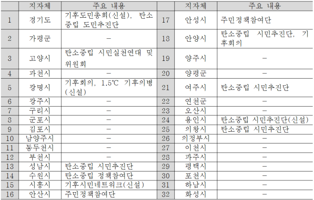 기후 기버넌스의 다른 축을 담당하는 기후위기대응위원회(탄소중립위원회) 구성 및 운영 실태도 중요하다. 경기 31개 시군 중 김포시, 남양주시, 동두천시, 안산시, 양평군은 위원회가 구성돼 있지 않다. 구성된 경우라도, 민관 거버넌스 측면에서 전반적으로 '민'보다 '관' 주도성이 다소 높은 것으로 평가된다. 최근 부분적으로 위원회의 다양성과 당사자성을 보장하는 흐름이 확인되지만, 여전히 미흡한 실정이다.