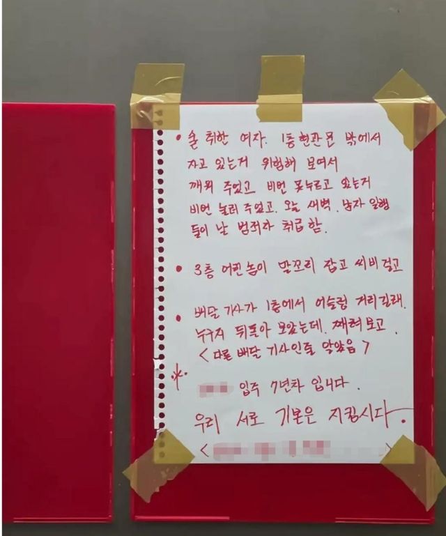 경고문 내용에 따르면 작성자는 며칠 전 새벽 2시가 넘어 담배를 피우러 나갔다가 1층 현관문 밖에 한 여성이 쓰러져 있는 모습을 발견했다. 그는 여성이 현관 밖에서 자고 있어 위험해 보여 깨웠고, 공동현관 비밀번호를 제대로 누르지 못하자 대신 눌러줬다는 취지로 당시 상황을 설명했다.