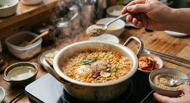 들깨가루는 가벼운 라면 국물에 묵직한 무게감을 더해준다. 라면 국물은 대개 맵고 짠맛이 강하지만, 들깨가루가 섞이면 국물이 진득해지면서 돼지 뼈를 오랫동안 푹 고아낸 육수와 비슷한 느낌을 준다. 들깨 특유의 구수한 맛이 라면의 자극적인 매운맛을 부드럽게 감싸주어 전체적인 맛의 결을 한층 높여준다.