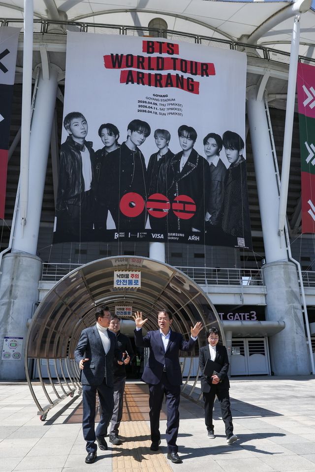 이동환 고양특례시장이 지난7일BTS콘서트가 열리는 고양종합운동장에 방문했다.이번 방문은9일 오후7시 고양시에서 개최하는BTS공연에 대비한 것으로,이 시장은 공연장 시설,준비사항등을 확인했다.한편, BTS월드투어 아리랑in고양은오는11일, 12일까지 총3회 |
