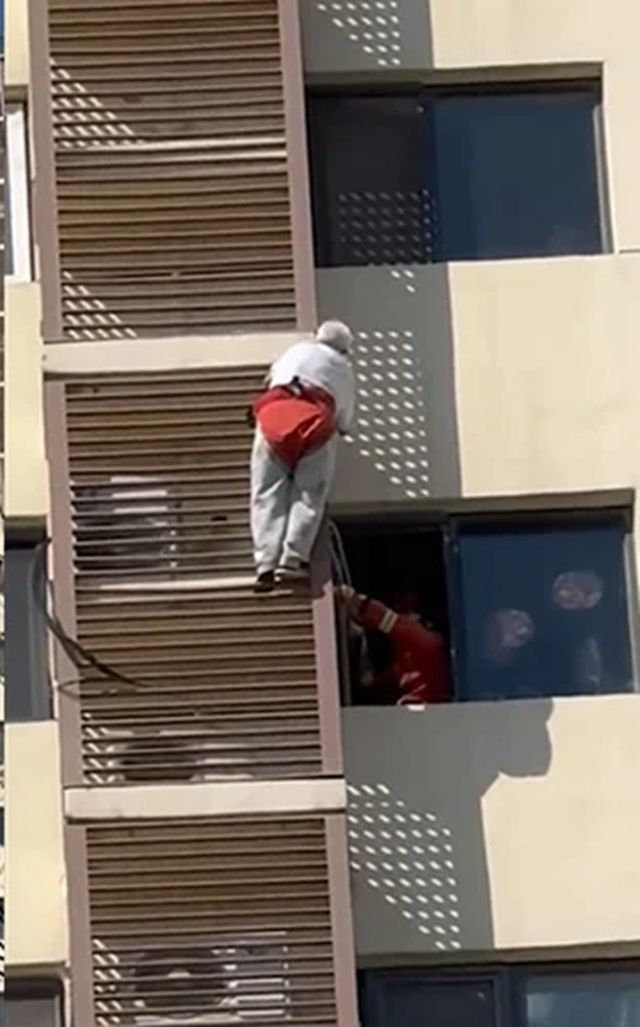 중국 한 아파트 외벽에서 89세 할머니가 구조대의 도움을 받아 창문 안쪽으로 옮겨지고 있다. 사진=더우인 갈무리
