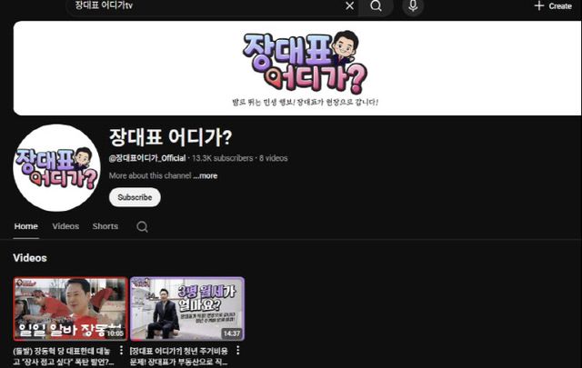 장대표 어디가? 채널은 장 대표가 민생 현장을 직접 찾아 현장의 목소리를 듣고 관련 정책을 소개하기 위해 지난 3일 개설됐다. 장동혁 대표로 검색했을 때 나오는 기존 유튜브 채널인 ‘장동혁의 끝장TV’와 다른 채널이다.