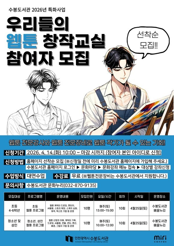 프로그램 참여 신청은 4월 14일 화요일 오전 10시부터 수봉도서관 공식 홈페이지를 통해 선착순으로 진행되며, 상세한 일정과 모집 인원은 홈페이지 내 공지사항에서 확인할 수 있다. 도서관 측은 이번 프로그램을 통해 주민들의 창작 역량을 강화하는 것은 물론, 진로 체험과 연계한 인재 양성에 힘써 수봉도서관이 지역 내 웹툰 창작 문화의 핵심 거점이자 문화 콘텐츠 활성화의 중심지로 자리매김하기를 기대하고 있다.