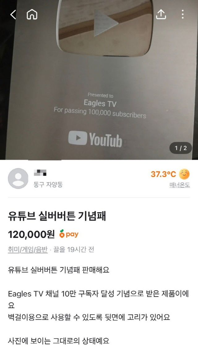 글에는 “유뷰트 실버 버튼 기념패를 판매한다”며 “Eagles TV 채널 10만 구독자 달성 기념으로 받은 제품이다. 벽걸이용으로 사용할 수 있도록 뒷면에 고리가 있다”고 게시했다.