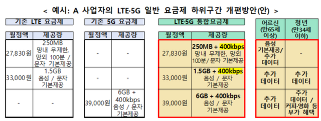 LTE·5G 일반 요금제 하위구간 개편방안 예시. ⓒ 과학기술정보통신부