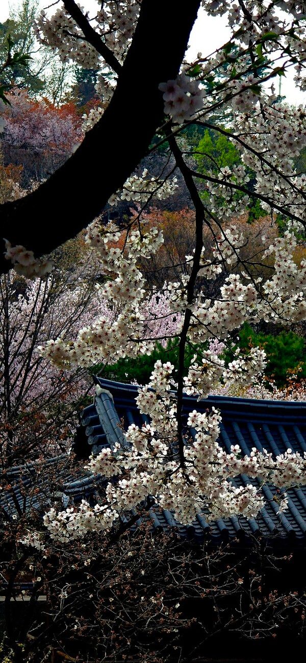 검은 기와의 단정한 선과 연한 벚꽃의 색이 어우러지니, 인공과 자연의 경계가 사라진 듯합니다.