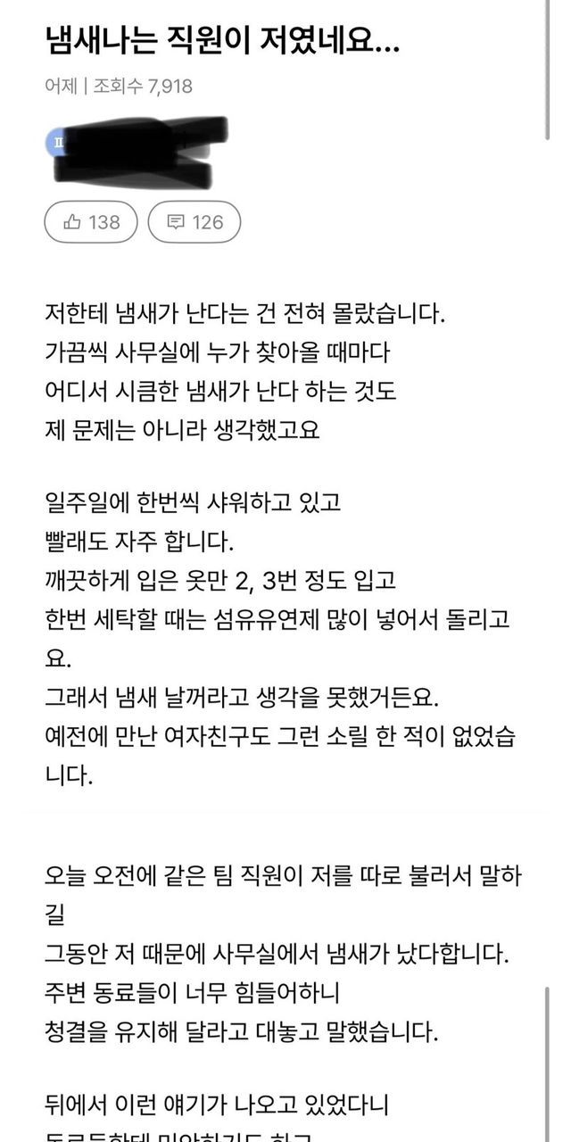 믿었던 동료들 사이에서 자신이 '악취 유발자'로 회자되고 있었다는 사실을 알게 된 A씨는 깊은 자책감과 함께 마음이 착잡해질 수밖에 없었습니다.