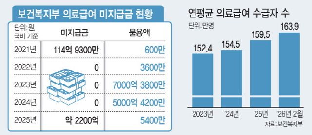 실제로 올해 수급자 증가세는 예사롭지 않다. 지난 2월 기준 의료급여 수급자는 163만 9000명으로, 본예산 편성 당시 예상한 연평균 수급자 160만 6000명을 이미 3만명 이상 넘어섰다. 2023년 152만명 수준이었던 수급자가 매년 가파르게 늘고 있어 지출 부담이 구조적으로 확대되고 있다.
