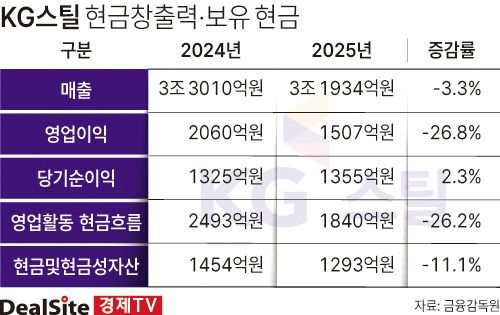 8일 금융감독원 전자공시시스템에 따르면 KG스틸의 지난해 영업이익은 1507억원으로 26.8% 감소했고, 영업현금흐름 역시 26.2% 줄어든 1840억원에 그쳤다. 건설 경기 침체로 철강 수요가 둔화되면서 본업의 현금창출력이 약화된 영향이다. 같은기간 당기순이익은 2.3% 소폭상승했지만 영업현금흐름은 무려 26.2% 축소된 1840억원으로 집계됐다.