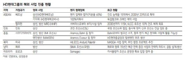 지역별로 다른 목적을 두고 전략을 짠 점도 눈에 띈다. 베트남과 필리핀은 글로벌 선박 시장에서 중국과 경쟁하기 위한 생산 거점 성격이 강하다. 반면 인도와 페루, 미국 등은 현지 내수 수요와 정책 지원을 겨냥한 투자다. 한 연구원은 이런 구조가 상선 업황이 둔화하더라도 그룹 전체 실적 변동성을 줄이는 역할을 할 것으로 분석했다.