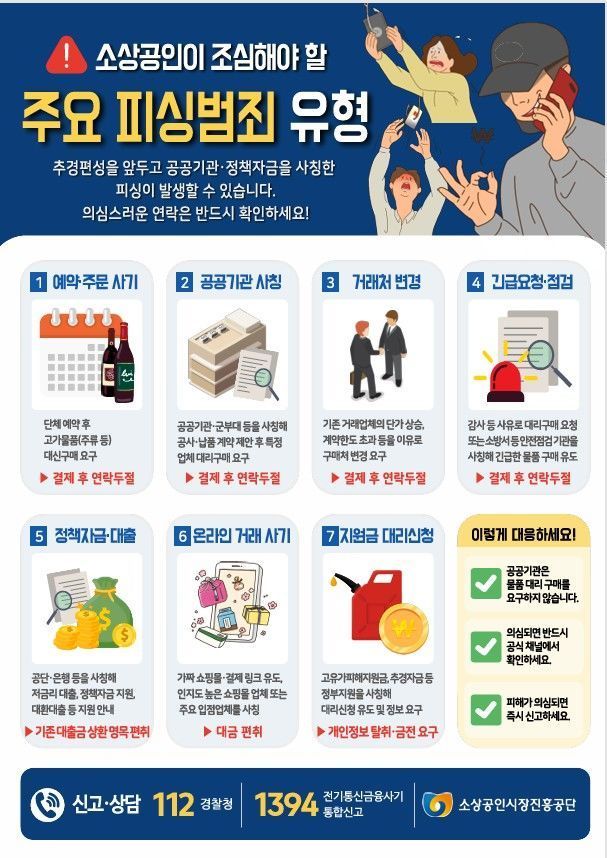 정책자금이나 지원사업과 관련해 의심스러운 연락을 받을 경우 '소상공인24' 등 공식 채널을 통해 반드시 사실 여부를 확인해야 한다. 또한 피해가 의심되면 경찰청이나 전기통신금융사기 통합대응단(1394)에 즉시 신고해야 한다.