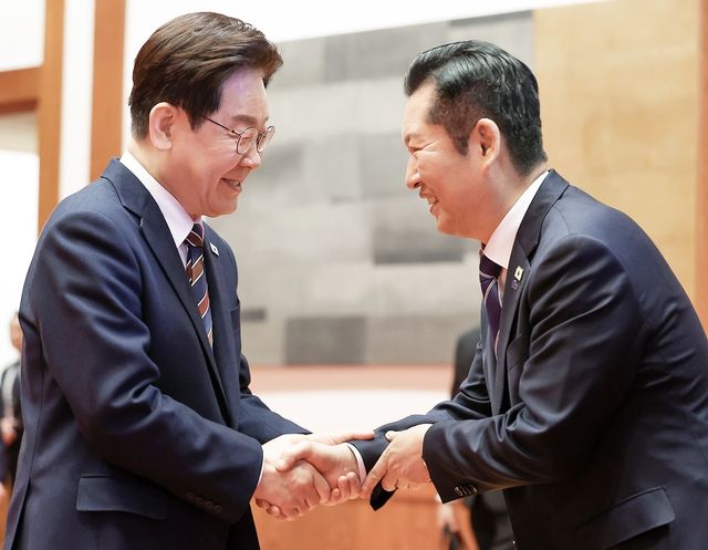 이재명 대통령과 정청래 더불어민주당 대표가 7일 청와대에서 열린 여야정 민생경제협의체 회담 및 오찬에서 악수하고 있다. 자료 사진. 정청래 대표가 이재명 대통령 취임 전 사진·영상 사용 자제 공문을 둘러싼 당내 혼란에 대해 "대통령에게 누를 끼치지 않으려고 보냈는데 오히려 반대로 누를 끼친 부분이 많이 있다"라며 사과했다. 정청래 대표는 10일 전남 담양농협 본점에서 열린 담양 현장 최고위원회의에 참석해 "얼마 전 후보들에게 대통령 영상이나 사진과 관련해 공문을 내렸는데 이것이 많은 혼란을 가져왔다"라며 이렇게 밝혔다. / 뉴스1