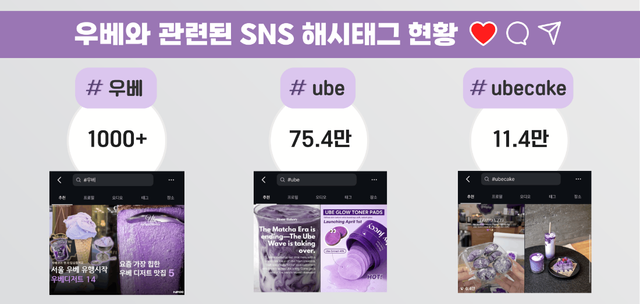 SNS 확산 속도 역시 빠르다. 인스타그램에서 '우베'를 검색하면 국내 게시물은 아직 1000건 수준에 머물고 있지만, 해외에서는 이미 'ube' 관련 게시물이 75만건 이상, 'ubecake'는 10만건을 넘어서며 하나의 글로벌 트렌드로 자리 잡았다. 특히 게시물 대부분이 보랏빛 색감을 강조한 이미지 중심 콘텐츠로 구성돼 있어 소비자 유입을 더욱 자극하는 구조다.