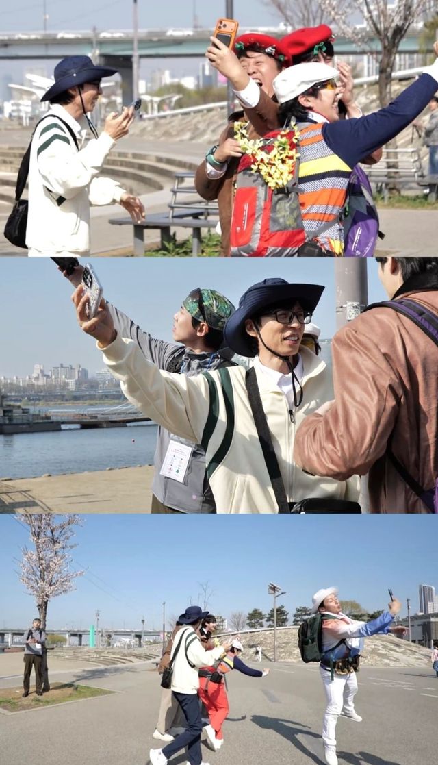 공개된 사진 속 벚꽃놀이 중 별안간 벌어진 변우석 쟁탈전이 눈길을 끈다. 벚꽃나무 아래 인증샷을 찍으려던 회원들은 각자 휴대폰을 들고 고군분투 중이다.
