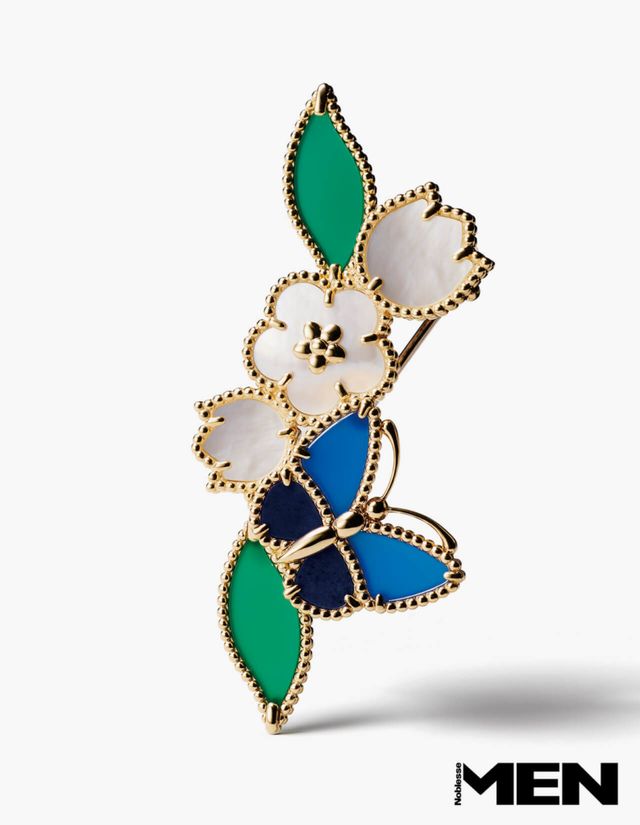 반클리프 아펠은 자연에서 길어 올린 상징과 정교한 세공으로 브랜드의 미감을 구축해왔다. 럭키 스프링 컬렉션은 그 정체성을 가장 또렷하게 보여주는 라인으로, 매화꽃과 은방울꽃 봉오리, 잎사귀, 무당벌레, 나비 같은 모티브에 삶을 긍정적으로 바라보는 시선을 담는다. 사진 속 버터플라이 클립 역시 그 흐름 위에 놓여 있다. 옐로 골드와 라피스라줄리, 블루·그린 아게이트, 화이트 머더오브펄을 조합해 작은 형태 안에 봄의 색과 생동감을 응축했다. 1906년부터 이어온 나비 모티브와 스톤을 다루는 세공력, 더블 비즈 컨투어와 로스트 왁스 캐스팅 같은 공예적 디테일이 맞물린다.