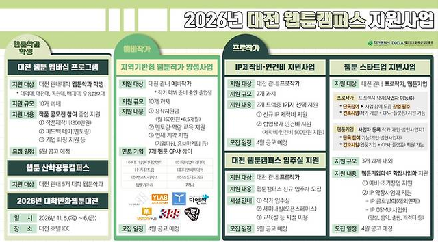 대전시와 대전정보문화산업진흥원이 지역 웹툰 산업 생태계 활성화를 위해 재학생부터 프로작가, 기업까지 아우르는 단계별 맞춤형 지원사업을 본격 추진한다. 이번 사업은 웹툰 IP 첨단클러스터 조성과 연계하여 지역 기반의 산업 육성에 속도를 내고, 창작자 발굴부터 사업화까지 이어지는 전주기 지원 체계를 구축하는 데 목적이 있다.