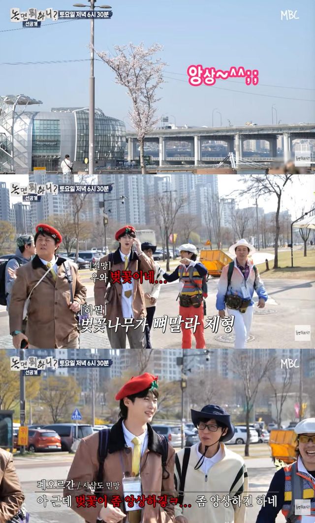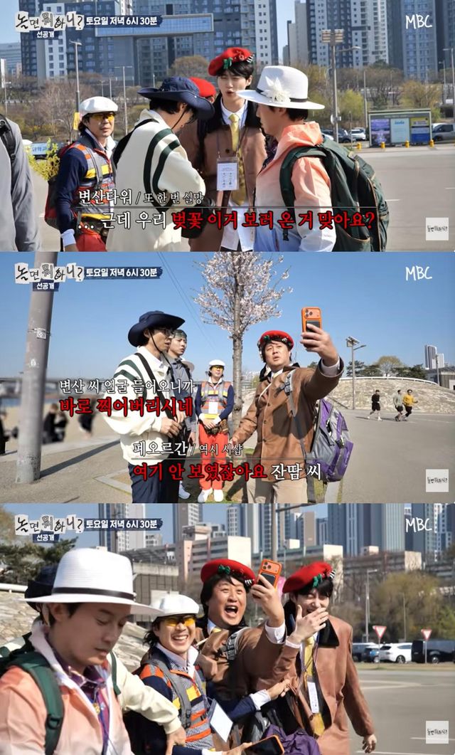 변우석은 벚꽃 앞에서 포즈를 취하는 유재석에게 "근데 우리 벚꽃 이거 보러 온 거 맞냐"고 재차 물어 웃음을 안겼다.