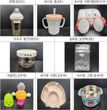 합성수지제, 고무제, 금속제, 유리제, 도자기제 재질의 젖병, 젖꼭지, 과즙망, 유아용 컵, 식판, 수저 등 총 240건을 대상으로 재질별 기준·규격 시험항목을 조사한 결과, 모두 기준·규격에 적합했다.