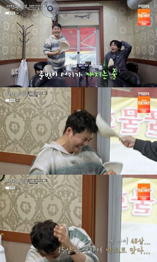이어 전현무도 한차례 막히자, 곽튜브 또한 전현무를 힘껏 때렸다. 전현무는 15살 어린 동생에게 머리를 맞고 박을 깨뜨려 웃음을 자아냈다.