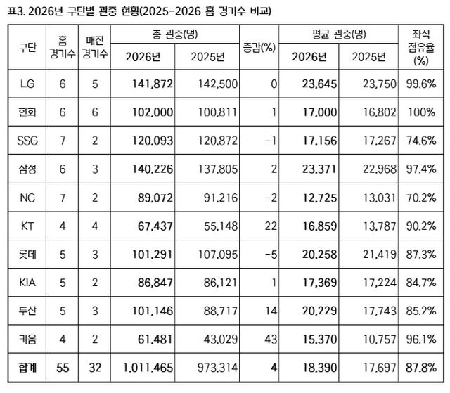 KBO는 10일 잠실, 고척, 수원, 대전, 대구에서 열린 5경기에 총 9만1459명이 입장해 올 시즌 누적 관중 101만1465명을 기록했다고 밝혔다.