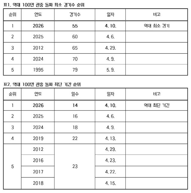 이로써 올 시즌 KBO리그는 55경기 만에 100만 관중을 넘어서며 역대 최소 경기 100만 관중 기록을 세웠다. 종전 기록인 2025시즌의 60경기보다 5경기나 빠르다.
