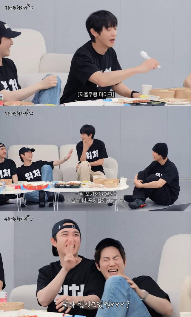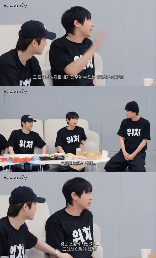 그는 "피아노는 그래도 한손으로 연주할 수 있으니 계속 하기로했다"며 "그런데 마이크가 계속 뒤로 가더라. 갑자기 뒤에서 감독님이 마이크를 손으로 계속 잡고 계셨다. 나랑 같이 무대했다"며 아직도 생생한 기억을 꺼내 멤버들을 웃게 했다.