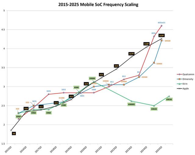 퀄컴은 이미 스냅드래곤 8 엘리트 Gen 5에서 기본 4.61GHz를 찍었고, 차기 스냅드래곤 8 엘리트 Gen 6 Pro가 5.00GHz에 도달할 수 있다. 미디어텍도 디멘시티 9600 Pro가 비슷하며, 애플 A19 Pro의 성능 코어가 4.26GHz까지 올라갔다.