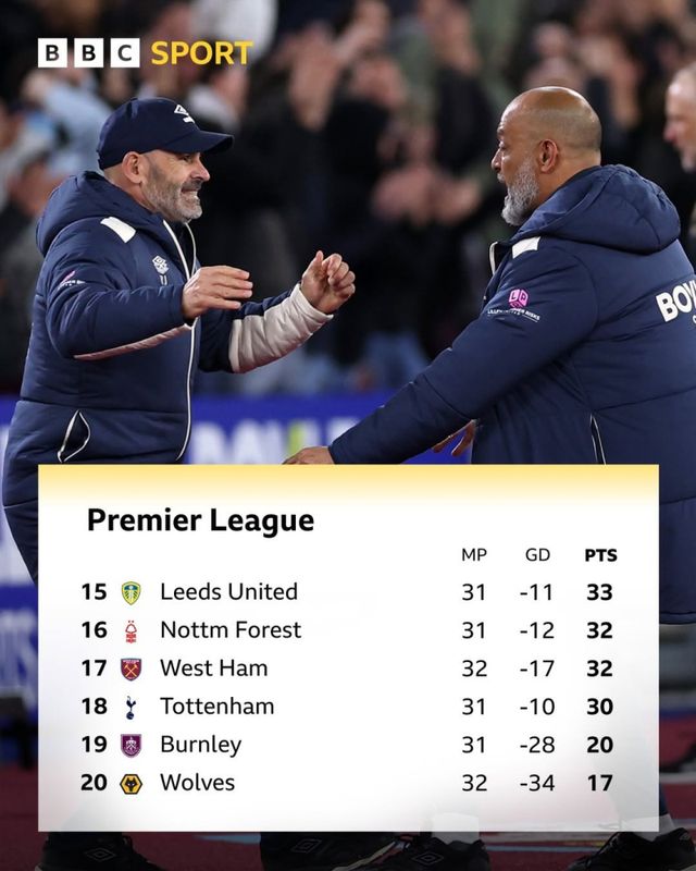 잉글랜드 프리미어리그(EPL) 웨스트햄이 울버햄프턴을 4골 차로 완파하며 강등권에서 탈출했다. 이 여파로 토트넘은 18위까지 추락했다.