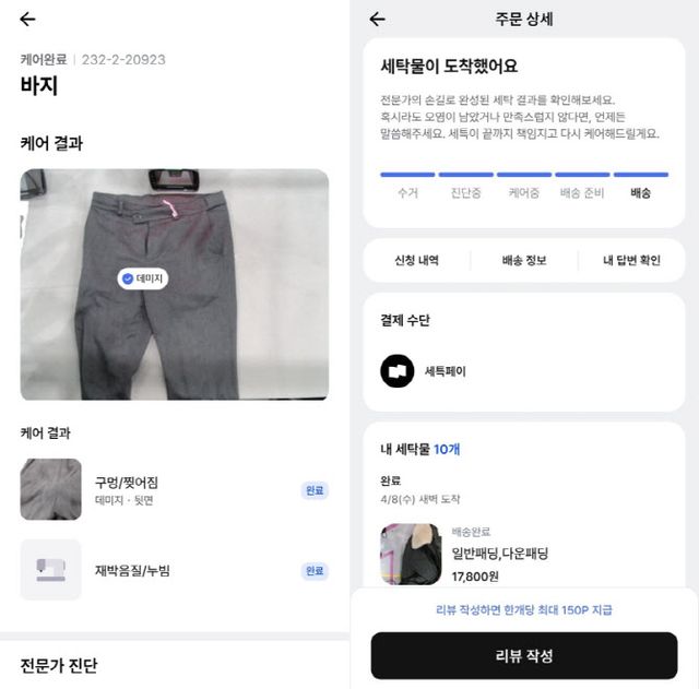 특히 ‘전문가 진단’ 기능은 비대면 서비스의 고질적인 문제인 ‘깜깜이 결제’를 해결했다. 전문가가 제안한 추가 케어 항목을 보고 고객이 직접 ①전체 수락 ②일부 선택 ③거절 후 기본 세탁만 진행 중 하나를 고를 수 있다. 또 세탁을 진행하지 않고 의류를 그대로 반환받는 옵션도 있다.