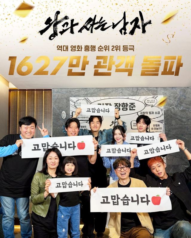 11일 오전 영화 '왕과 사는 남자'(왕사남)'의 배급사 쇼박스는 공식 SNS를 통해 "역대 영화 흥행 순위 2위 달성" 소식을 전하며 이를 기념하는 사진과 영상을 공개했다. 공개된 게시글에는 연출을 맡은 장항준 감독을 비롯해 단종 역의 박지훈, 엄흥도 역의 유해진을 중심으로 유지태, 전미도, 김민, 이준혁, 김수진 등이 한자리에 모여 작품의 성과를 함께 기뻐하는 모습이 담겼다. 이들은 "고맙습니다"라고 적힌 플래카드를 들고 환한 표정으로 관객들에게 감사의 뜻을 전했다.