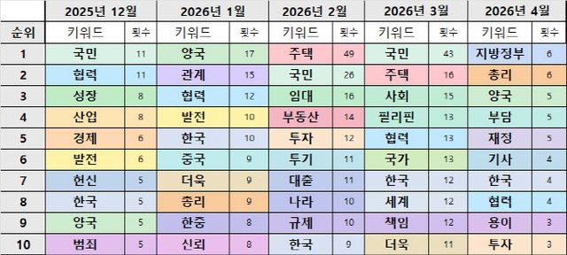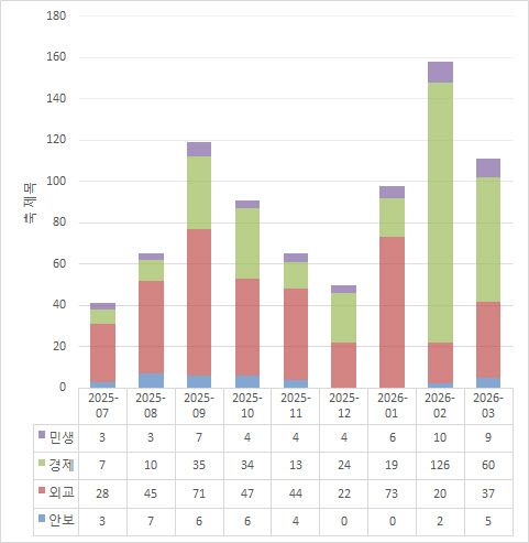 월별로 쓰인 단어를 보면 이재명 정부가 지난해 6월 출범 이후 어떤 일을 겪었는지가 주마등처럼 지나갑니다. 2025년 11월까지는 외교의 비중이 컸습니다. 중국·일본 순방이 있었던 올해 1월에도 비슷한 추세를 보였습니다. 이후 2월부터는 경제 분야 단어의 빈도가 단연 높아졌습니다.
