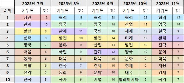 월별 키워드를 보면 이재명 정부의 흐름이 드러납니다. 2025년 7월에 ‘통화’가 등장하는데, 이는 취임 이후 각국 정상들과의 전화 통화를 의미합니다.