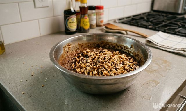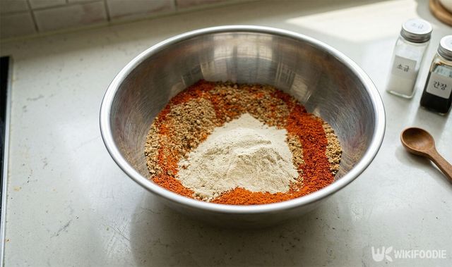 여기에 물 1컵과 멸치 가루 2큰술, 다시마가루 1큰술, 잘게 썬 말린 표고버섯을 넣고 함께 버무린다. 가루 형태의 육수 재료는 맛을 훨씬 깊게 만들고, 특히 버섯은 고기 같은 풍미를 더해준다.