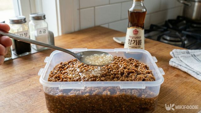 재료를 섞은 된장은 중간 불에서 은근하게 끓이며 남은 덩어리를 완전히 풀어준다. 한 번 끓어오르면 불을 줄이고 농도를 살핀다. 이때 메주가루 2큰술을 넣어 질감을 걸쭉하게 맞추면 질감이 안정된다.