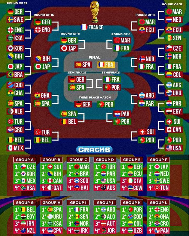 A조 1위로 예측된 체코는 I조 3위로 전망된 노르웨이와 격돌하고 A조 3위로 처지만 3위 팀 중 상위 8개 팀 자격으로 32강에 진출하는 멕시코는 G조 1위 벨기에를 만나 탈락하는 시나리오다.