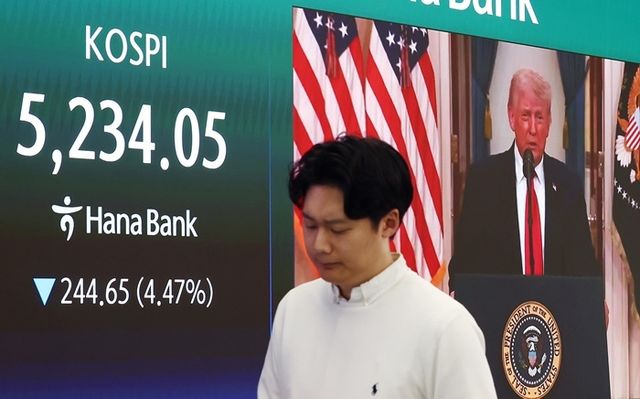 코스피·코스닥 지수가 급락하면서 매도 사이드카(프로그램 매도호가 일시 효력 정지)가 발동된 2일 오후 서울 중구 하나은행 딜링룸에 도널드 트럼프 미국 대통령의 이란 전쟁 관련 대국민 연설 뉴스가 나오고 있다. 이날 코스피는 전 거래일(5478.70)보다 244.65포인트(4.47%) 내린 5234.05, 코스닥 지수는 전 거래일(1116.18)보다 59.84포인트(5.36%) 하락한 1056.34에 거래를 마쳤다. 원·달러 환율은 전 거래일(1501.3원)보다 18.4원 오른 1519.7원에 주간 거래를 마감했다. 2026.4.2 / 뉴스1